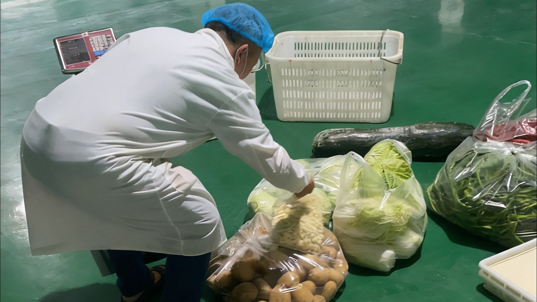 清晨即起,嚴(yán)把安全關(guān)卡。10月3日早上6點(diǎn),天光未亮,中心倉(cāng)已是燈火通明。倉(cāng)庫(kù)門(mén)口,工作人員正對(duì)首批送達(dá)的蔬菜執(zhí)行嚴(yán)格的“到貨四步法”:稱重核斤兩、觀色辨新鮮、溯源查憑證、記錄保精準(zhǔn),確保每一份食材從源頭就符合標(biāo)準(zhǔn)。